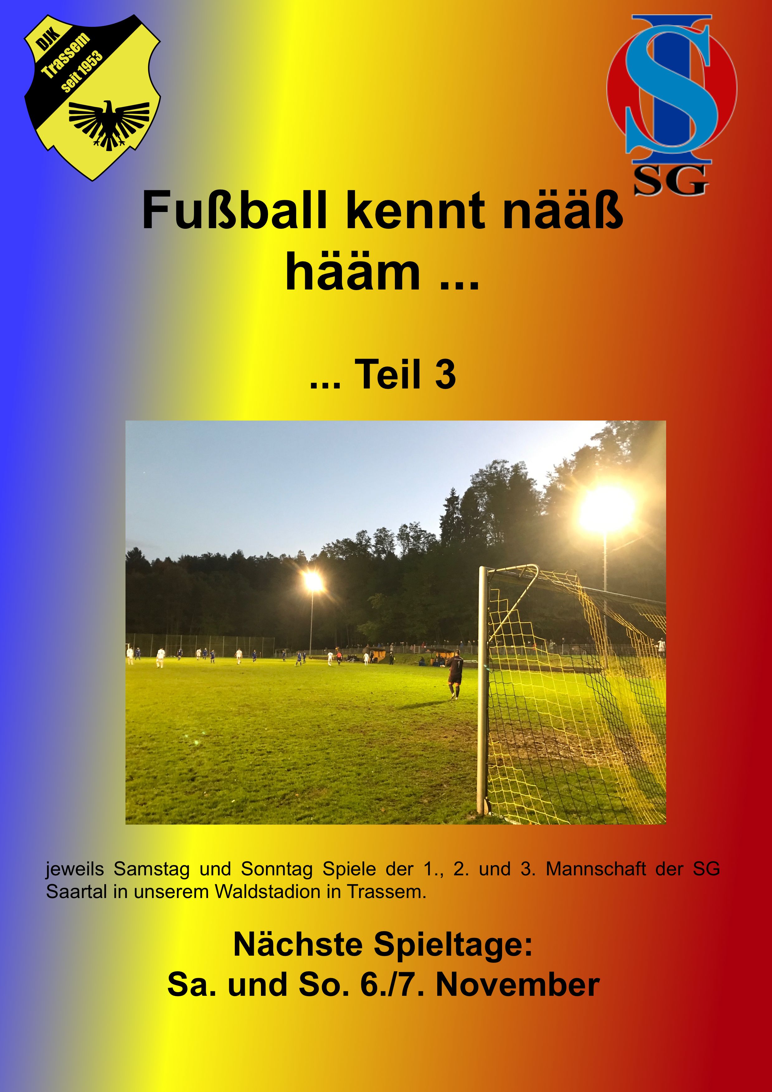 Aller guter Dinge sind drei: nach den erfolgreichen letzten beiden Heimspielwochenenden freuen wir uns auf den 3. Heimspieltag unserer SG Saartal bei uns im Trassem in unserem Waldstadion. Hier euer Programm für das nächste Wochenende: